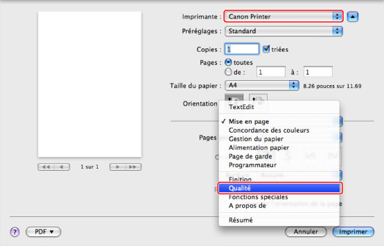 Sélectionner l'imprimante à utiliser → sélectionner le panneau [Qualité].