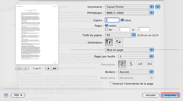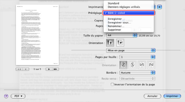 Sélectionner l'imprimante à utiliser → sélectionner [B&W/2-sided] sur la liste [Préréglage] .