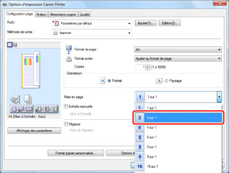 Sur la feuille [Configuration page], sélectionner [2 sur 1] sous [Mise en page].