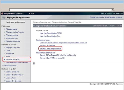 Accéder à l'interface utilisateur distante → cliquer sur [Réglages/Enregistrement] → [Réglages de fonction] → [Recevoir/Transférer] → [Réglages verrouillage mémoire].