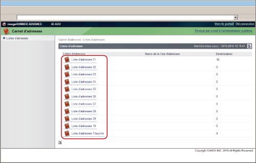 Accéder à l'interface utilisateur distante → cliquer sur [Carnet d'adresses] → sur la page Listes d'adresses, cliquer sur la liste d'adresses à enregistrer.