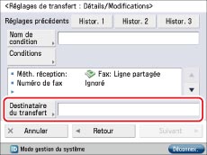 Appuyer sur [Destinataire du transfert] → sélectionner le numéro de télécopieur du bureau B mémorisé à l'étape 2 dans le carnet d'adresses → appuyer sur [OK] → [Suivant].