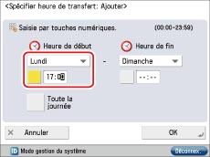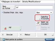Appuyer sur [Spécifier H. transfert] → indiquer l'heure et le jour d'effet de la condition de transfert.