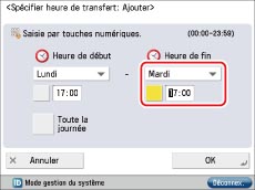 Sélectionner [Mardi] pour l'option <Heure de fin> → appuyer sur [
