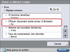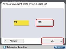 → [Réglages de fonction] → [Envoi]→ [Réglages communs] → [Supprimer document après erreur d'émission].