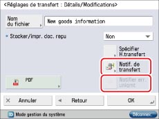 On peut définir l'envoi de messages de notification uniquement lorsqu'une erreur de transfert est détectée. Sélectionner une condition de transfert → appuyer sur [Détails/Modif.] → sélectionner [Notif. de transfert] et [Notifier err. uniqmt].