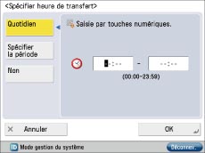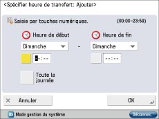 La sélection de [Spécifier H.transfert] permet de valider/d'invalider des réglages de transfert en fonction du jour ou de l'heure. Par exemple, on peut invalider le transfert pendant les heures auxquelles l'ordinateur est éteint (la nuit, le week-end ou les jours fériés par exemple).