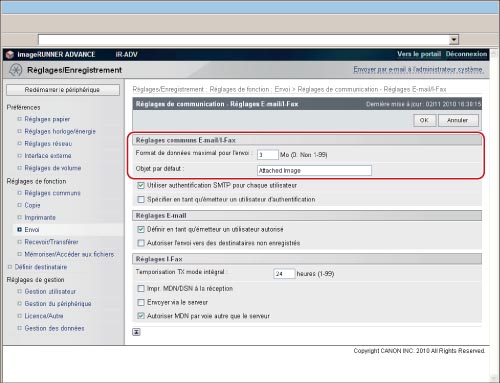 → [Réglages de fonction] → [Envoi] → [Réglages E-mail/I-Fax] → [Réglages de communication].La fonction I-fax des machines imageRUNNER ADVANCE utilise le protocole SMTP pour la transmission.