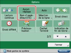 Seuls les réglages mémorisés peuvent être sélectionnés pour "Nom de l'expéditeur" et "Répondre à". Il est impossible de saisir un nouveau destinataire dans l'écran Options. Mémoriser le destinataire dans Réglages/Enregistrement. Le "Nom de l'expéditeur" affiché à l'écran de réception est le nom de l'unité défini pour la machine imageRUNNER ADVANCE chargée de l'envoi. Le réglage "Nom de l'expéditeur" n'est pas renseigné.