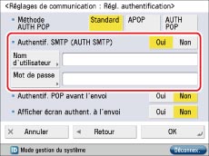 Si l'environnement du serveur de messagerie nécessite l'authentification SMTP, associer "Oui" à ce réglage et entrer le nom d'utilisateur et le mot de passe.