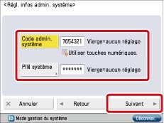 Saisir un numéro (sept chiffres maximum) dans [Code admin. système] et dans [PIN admin. système] → appuyer sur [Suivant].