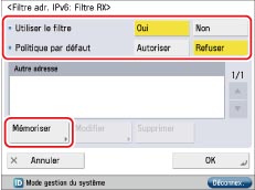 Appuyer sur [Oui] pour [Utiliser le filtre] → appuyer sur [Refuser] pour <Politique par défaut> → appuyer sur [Mémoriser].