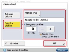 Appuyer sur [Spécifier préfixe] → indiquer une adresse de préfixe pour IPv6 afin d'autoriser la transmission des données → appuyer sur [OK].