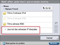 Cliquer sur [Réglages/Enregistrement] → [Préférences] → [Réseau] → [Journal des adresses IP bloquées].