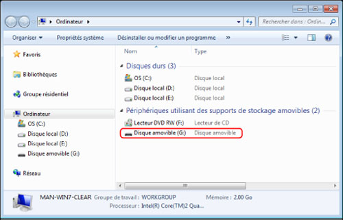Cliquer sur [Démarrer] → [Ordinateur] → sélectionner le support mémoire.