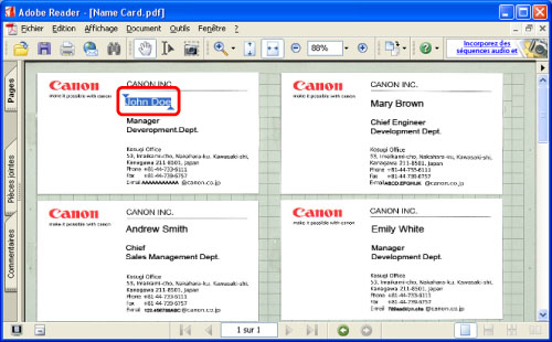La lecture avec la fonction OCR (rech. texte poss.) permet de convertir des cartes de visite en fichier PDF ou XPS avec prise en charge des recherches. Le mode PDF avec prise en charge des recherches s'avère utile dans différentes situations. Cette section explique comment créer des étiquettes d'adresse avec la fonction [Fusion et publipostage] de Microsoft Word 2003.