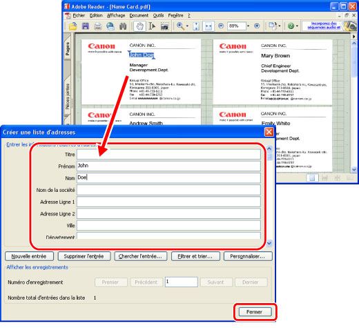 Lorsque les informations de toutes les cartes de visite sont saisies, cliquer sur [Fermer].