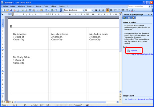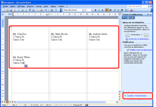Cliquer sur [Imprimer] dans [Fin de la fusion].