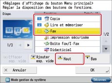 Cette section indique comment afficher trois touches, [Copie], [Lire et mémoriser] et [Fax], dans cet ordre, sur l'écran Menu principal.