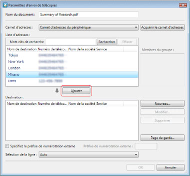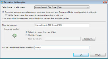 Vous pouvez configurer la page de garde dans la boîte de dialogue [Paramètres d'envoi de télécopies]. Pour plus d'informations, consultez « Référence ».