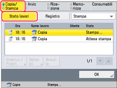Premendo [Annulla] sulla schermata che viene visualizzata durante la copia o l'attesa di copiatura, è possibile annullare il lavoro in fase di copiatura o l'ultimo lavoro in attesa di copiatura per il quale è stato acquisito un originale.