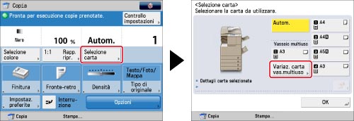 È possibile registrare tipi di carta che non sono indicati nell'elenco delle impostazioni dettagliate in <Variazione carta vassoio multiuso: Tipo di carta>. Per maggiori informazioni sulla registrazione del tipo di carta, vedere "Registrazione/modifica dei tipi di carta personalizzati".