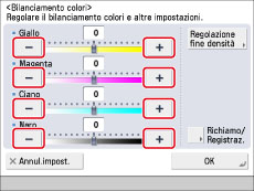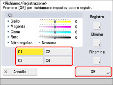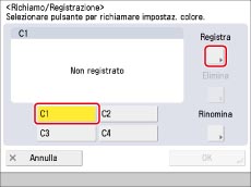Specificare le impostazioni di bilanciamento colori e densità da memorizzare → premere [Richiamo/Registraz.].