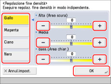 Per regolare la densità di ciascun colore, premere [Regolazione fine densità]. Selezionare il colore che si desidera regolare → utilizzare [-] o [+] per regolare il livello di densità per le aree di densità più scura (alta), media e più chiara (bassa) → premere [OK].
