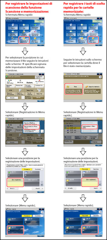 Per istruzioni sulla registrazione delle impostazioni in un pulsante personale/pulsante condiviso, vedere la spiegazione esemplificativa per la funzione Scansione e invio in "Registrazione di un pulsante personalizzato/pulsante condiviso".