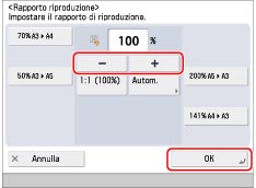 Utilizzare [-] e [+] per specificare il rapporto di zoom → selezionare [OK] → [Chiudi].