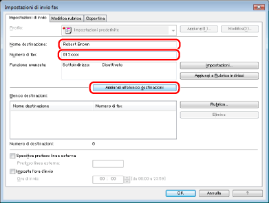 Specificare il nome del destinatario e il numero di fax → fare clic su [Aggiungi all'elenco destinazioni].