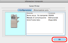 Se il nome del driver della stampante visualizzato nella parte superiore della finestra di dialogo [Informazioni stampante] e il nome della stampante visualizzato come [Nome recuperato dalla stampante] non corrispondono, potrebbe non essere possibile utilizzare correttamente le funzioni della stampante. In tal caso, cancellare la stampante aggiunta in [Preferenze di Sistema] e provare ad aggiungerla di nuovo. Per maggiori informazioni vedere la Guida di Installazione del Driver Stampante (vedere " Installazione").