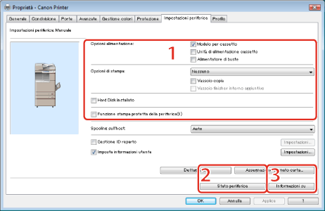 È possibile richiamare le informazioni sulla periferica e aggiornare le impostazioni visualizzate nella scheda (vedere "Impostazione delle opzioni della stampante").