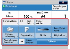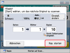 . Nähere Informationen zum Abbrechen des Kopiervorgangs finden Sie im Abschnitt "Abbrechen eines Auftrags".Nähere Informationen zum Abbrechen des Kopiervorgangs zugunsten wichtiger Zwischenkopien finden Sie im Abschnitt "Funktion <Unterbrechung>".