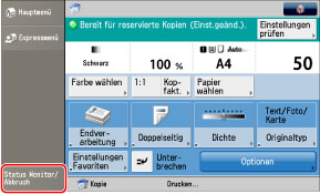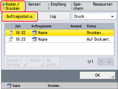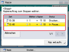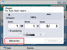 Wenn Sie die Taste [Abbrechen] auf dem Popup-Display berühren, das während des Kopiervorgangs oder des Wartens darauf angezeigt wird, können Sie den aktuellen Kopiervorgang oder den letzten Auftrag abbrechen, den Sie gescannt haben und der sich in der Warteschlange befindet.