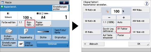 Berühren Sie die Taste [X] und [Y] → Stellen Sie mit [-] oder [+] die jeweiligen Kopierfaktoren ein.