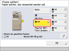 Berühren Sie die Taste [Papier wählen] → Wählen Sie das Papier zum Kopieren aus.