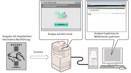 Sie können eingebettete Nachführungsinformationen auf der Ausgabe analysieren und herausfinden, von wem, wann und mit welchem System das Dokument ausgegeben wurde. Zur Analyse der Nachführungsinformationen wird das entsprechende Analysetool benötigt. Nähere Informationen finden Sie im Abschnitt "Document Scan Code Analyzer for MEAP."