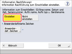 Für anwenderdefinierten Text berühren Sie die Taste [Anwenderdef. Zeichen] → Geben Sie den Text ein → Berühren Sie die Taste [OK].