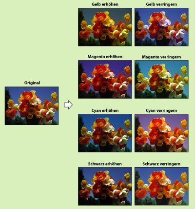 Sie können Feinjustagen an der Farbgebung auf dem Druck vornehmen, indem Sie die relativen Anteile und die Dichte der einzelnen Druckfarben Gelb, Magenta, Cyan und Schwarz verändern. Sie können die Justagen an der Farbgebung auch zur späteren Verwendung speichern.