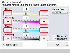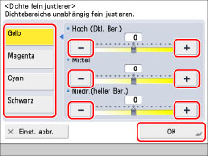 Um die Dichte jeder Farbe zu justieren, berühren Sie die Taste [Dichte fein justieren]. Wählen Sie die Farbe, die Sie justieren möchten → Verwenden Sie [-] oder [+], um die Dichte für dunkle (hoch), mittlere und hellere Bereiche (niedrig) zu justieren → Bestätigen Sie durch Berühren der Taste [OK].