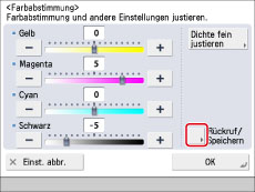 Definieren Sie die Einstellungen für Farbabstimmung und Dichte, die Sie speichern möchten → Berühren Sie die Taste [Rückruf/Speichern].