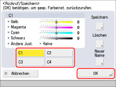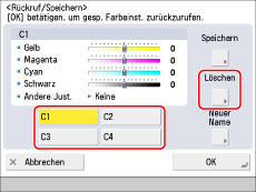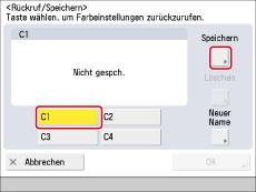 Wenn Sie eine Speichertaste berührt haben, auf der keine Farbabstimmung gespeichert ist, ist die Taste [OK] gedimmt und nicht aktiv. Sie können eine andere Speichertaste auswählen, auf der keine Farbabstimmung gespeichert ist, oder [Abbrechen] berühren.