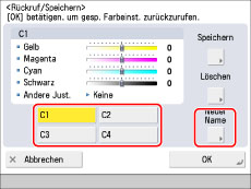 Wählen Sie eine Speichertaste ([C1] bis [C4]) zum Benennen → Berühren Sie die Taste [Neuer Name].