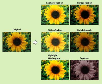 Sie können den farbigen Gesamteindruck eines Drucks durch Berühren einer einzigen Taste verändern. Folgende sechs Möglichkeiten sind verfügbar.