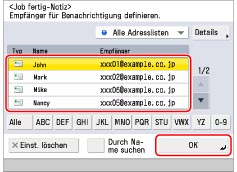 Wählen Sie den Empfänger für die Job fertig-Notiz → Berühren Sie die Taste [OK].