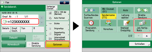 Wählen Sie den Empfänger → Berühren Sie nacheinander die Tasten [Optionen] → [Job-fertig-Notiz].