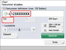 Geben Sie die Faxnummer des Empfängers mit den Zahlentasten - ein → Wenn die Gegenstelle antwortet und die aufgezeichnete Ansage des Fax-Informationsservices ertönt, berühren Sie die Taste [Ton].