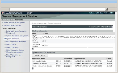 Sie können Versionsdaten hinsichtlich der Plattformen (z. B. Java Virtual Machine) und Versionsdaten, das Installationsdatum, den aktuellen Status usw. der Systemanwendungen prüfen.