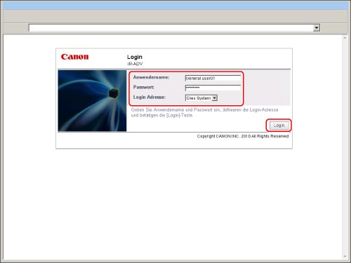 Geben Sie den Anwendernamen und das Passwort eines Anwenders ein, der als Anwender für das Local Device Authentication System in SSO-H definiert ist → Wählen Sie [Dies System] als Login-Adresse aus → Klicken Sie auf [Login].